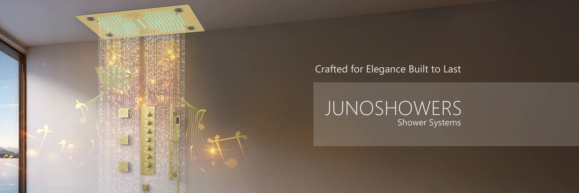Juno Wall-Mounted Brushed Gold 4-Function Shower Panel with Rainfall, Waterfall, Body Jets & Handheld Wand Transform your bathroom into a spa-inspired retreat with the JunoShowers 4-Function Brushed Gold Shower Panel System. Designed with a bar-shaped shower head and finished in elegant brushed gold, this wall-mounted unit combines durability, innovation, and...