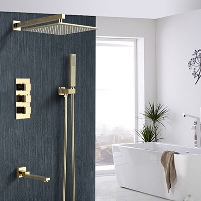 Juno Thermostatic Square Rainfall Style Wall Embedded Gold Shower Faucet Set With Tub Spout From finishes that are guaranteed to last a lifetime, to faucets that perfectly balance your water pressure. Our Juno gold shower set switch between different modes according to your mood. And with a lifetime limited warranty, you can...