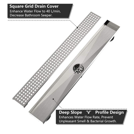 Juno Brushed Gold 48 inch Bathroom Shower Drain Juno linear drain features a deep slope design, ensuring fast flow drainage at Avg 53L/min (Max 100L/min) and enhancing drainage perfermance in various settings including kitchen, bathroom, garage, gym and more. The shower drain move-out grate design makes daily maintenance a breeze....