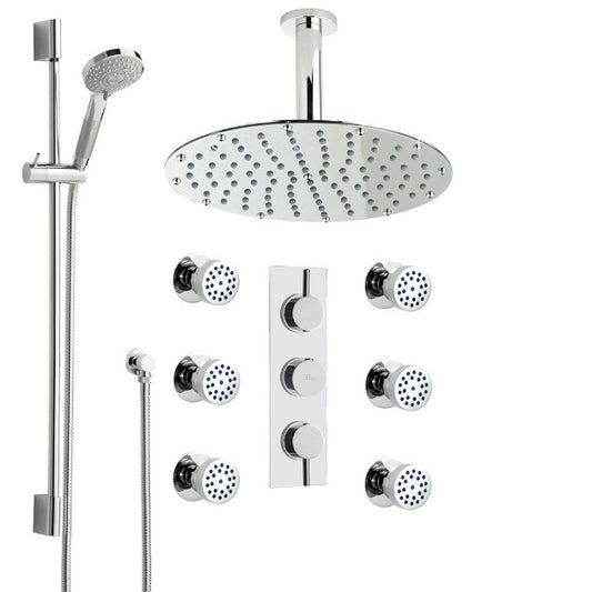 Juno 8", 10", 12", 16" Milano Chrome Finish Ceiling Mount Shower Head with 6 Body Jets Hand Shower Milano chrome shower systems, solid brass made with a high quality chrome plated finish the thermostatic shower valve features stylish yet easy to use handles that control the flow and temperature of...