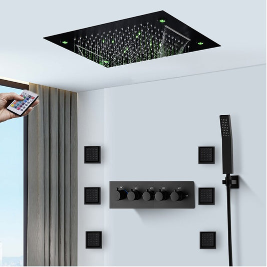 New Juno Rainfall Waterfall 4 Function Black LED Shower Head Set with 6 Body Massage Shower Jet This multifunction LED concealed ceiling rainfall waterfal bathroom shower set is perfect for anyone who wants to add a touch of luxury to their daily routine. The four functions mixing valve body jets...