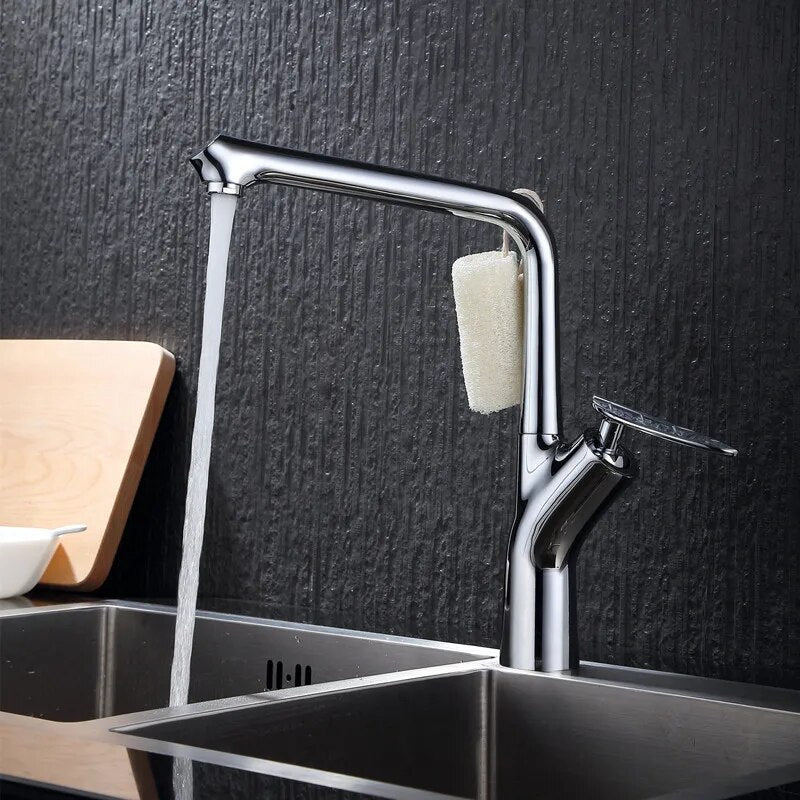 This Brass Kitchen Faucet complements kitchens with modern or contemporary decor. A unique leaf shaped handle makes it quite attractive.