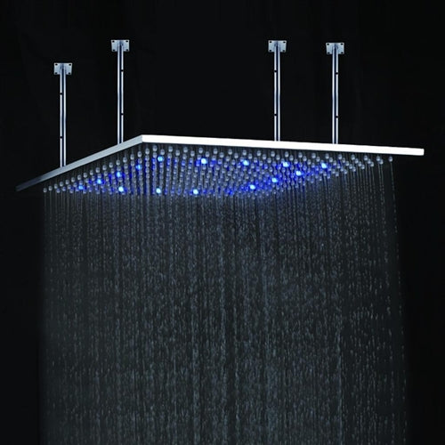 Juno Luxury 20x40 Large Brushed LED Rain Shower Head This flush shower head will change its color by detecting water temperature. Stainless steel with 4 shower arm ceiling mount shower head. Product Information: Name: LED Rainfall Shower HeadWarranty: 1 year of manufacturing warrantyMaterials: Solid BrassPower: Water energy, no need any...