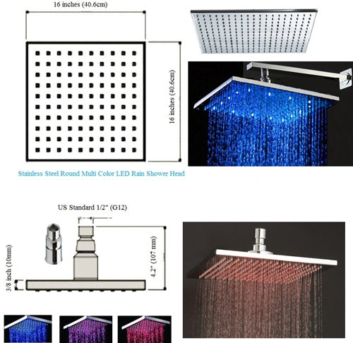 Juno 16" Stainless Steel Square Color Changing LED Shower Head This 16 inch rain shower head is installed as Ceiling Mount. This high tech rain shower head powers the LED lights using a built in hidden dynamo The lights will automatically turn on when water pressure is turned on The...