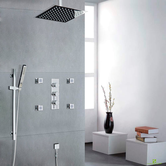 Juno Square 16" LED Rainfall Waterfall Ceiling Mount Remote Control LED Showerhead Juno 16" square LED shower comes in a bathroom ceiling mount shower and it has multiple 64 colors changing feature with remote control. It comes in a 2 different finish chrome and black and with 3 different showering...