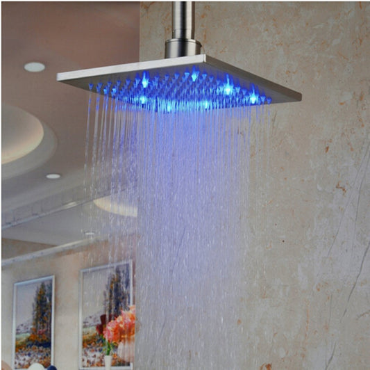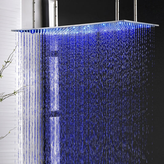 Juno Luxury 20x40 Large Brushed LED Rain Shower Head This flush shower head will change its color by detecting water temperature. Stainless steel with 4 shower arm ceiling mount shower head. Product Information: Name: LED Rainfall Shower HeadWarranty: 1 year of manufacturing warrantyMaterials: Solid BrassPower: Water energy, no need any...
