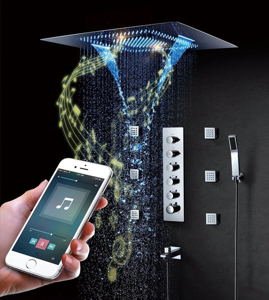 Juno Musical Rectangular Chrome Finish Ceiling Mount Phone Control LED Shower Head With Thermostatic Faucet Set Juno rectangular musical LED shower comes in its a bathroom ceiling mount shower and It has multiple 3 colors changing feature with remote control. It comes in a chrome finish polished and the installation...