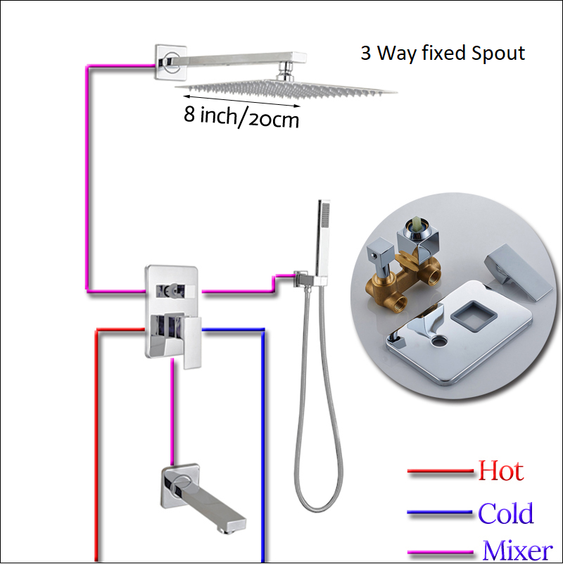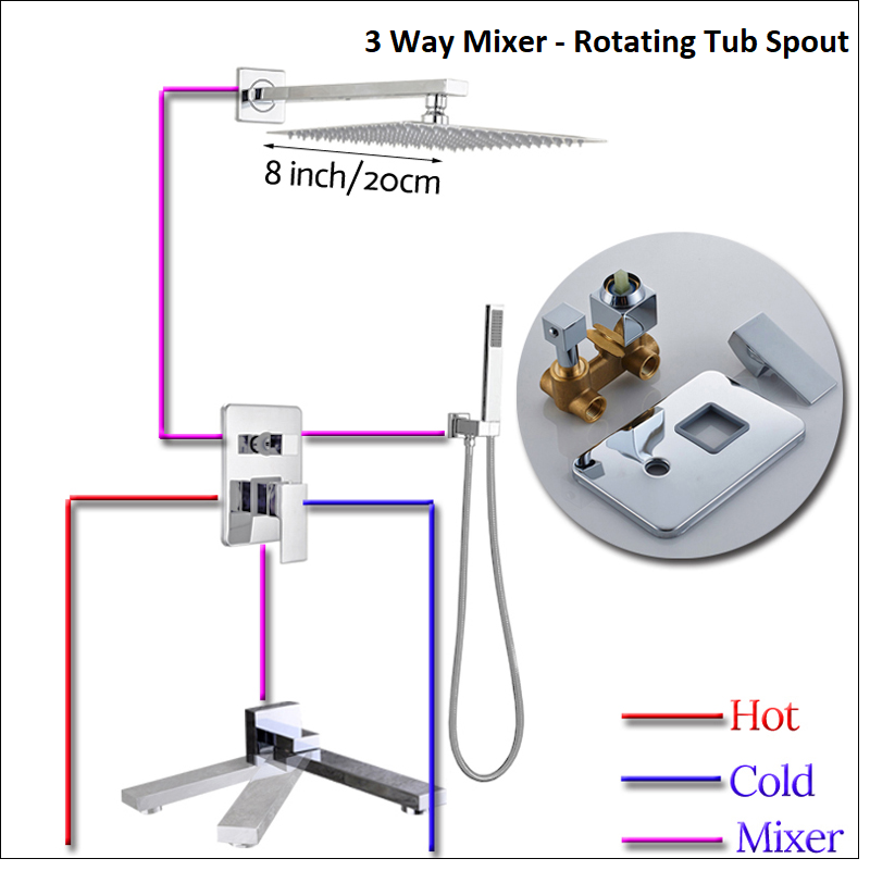 Juno 3-functions rain wall mount bathroom showerhead comes in chrome finish. It is a type of a single handle bathroom wall mounted shower with rotating tub spout. It has a contemporary look. It comes in a ceramic valve core material & brass body faucet material. It can use a mixer for hot & cold water. This product has 4 different sizes. It has also a feature of ABS plastic material hand shower & hand shower bracket.