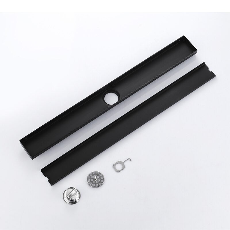 Black stainless steel linear floor shower drain. Color matte black and rectangle in size.