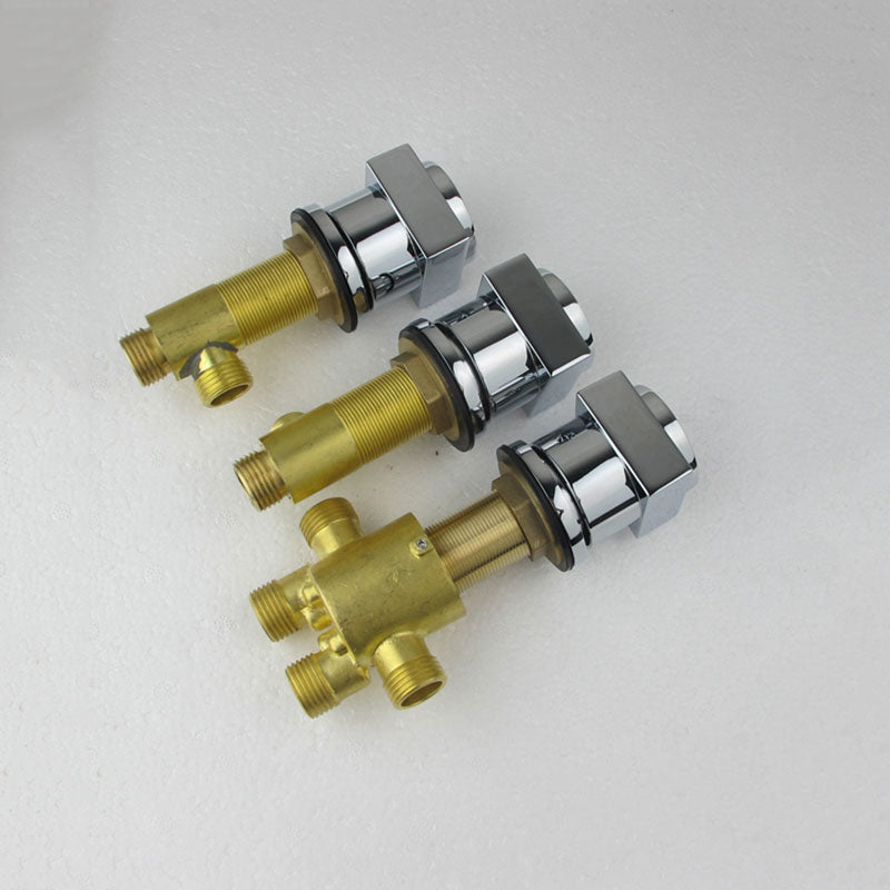 Chrome finish deck mount triple handle bathtub shower faucet set for personal and commercial uses like hotels, airports, restaurants and home use.