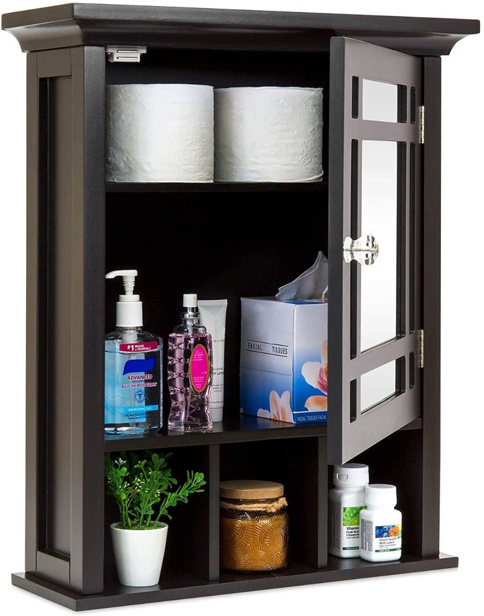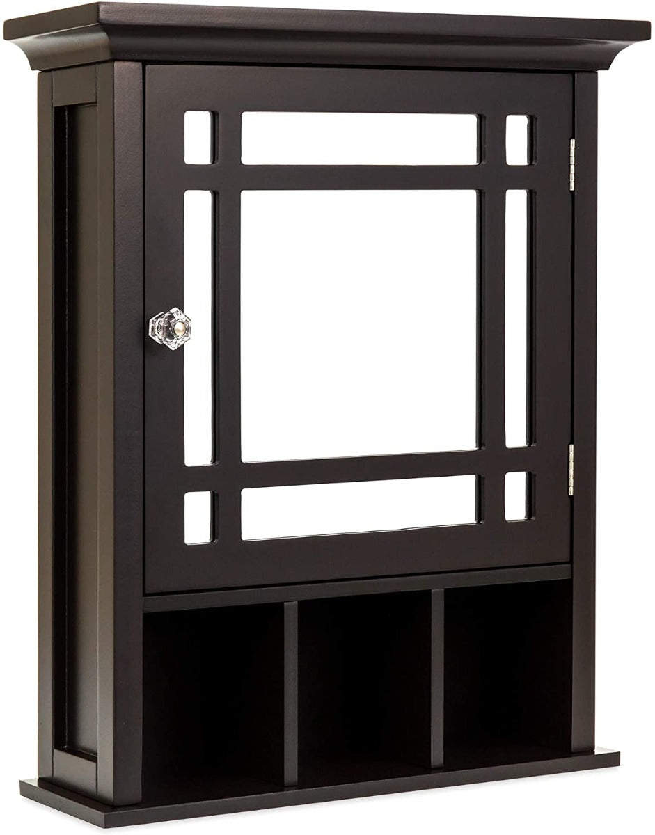 Convenient and beautiful mirrored door adds everyday function to this medicine storage cabinet. Safely store necessities or sundries of various sizes with an easily adjustable internal shelf. Three built-in storage cubbies keep your toothbrush, soap, or toiletries at arm's reach. Bring style and function to your bathroom with a modern grid design, crown molding, and a crystal knob.