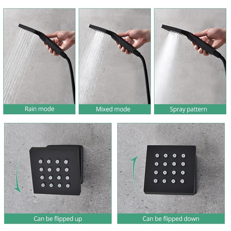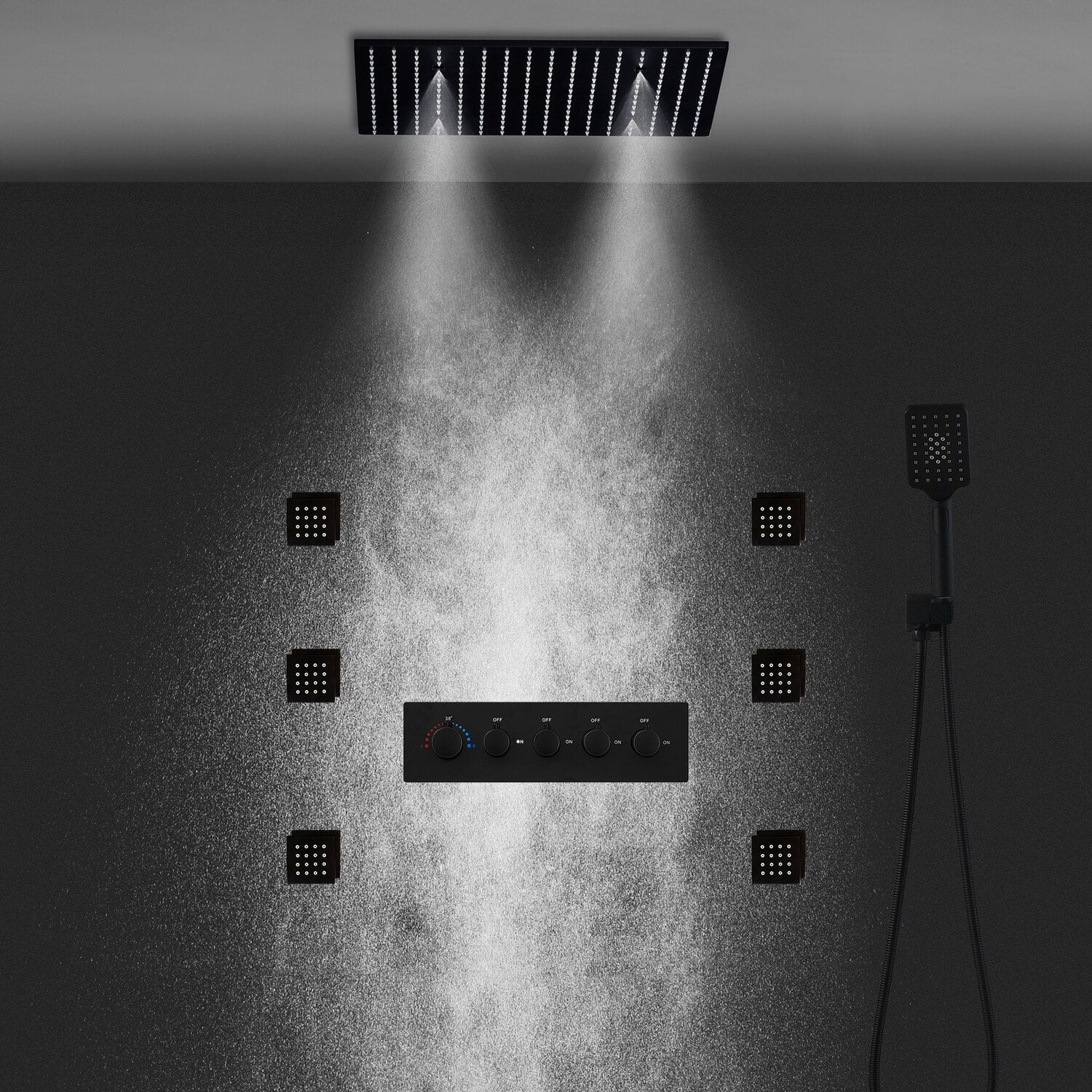 Looking for a luxurious shower experience? Look no further than the Commercial Black ceiling mount LED Shower Head! This top-of-the-line shower head features a commercial black LED lighted rain shower head, ceiling mount, 6 body jets, and handheld shower, providing you with the ultimate in showering luxury. The powerful jets provide a refreshing rainfall massage, while the built-in LED lighting creates a spa-like atmosphere. The hand held shower is perfect for rinsing off after a workout or for bathing your children or pets.