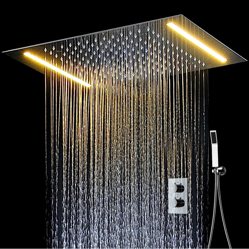 Ceiling Mounted Electric LED Chrome Rainfall Bathroom Shower comes in its a Bathroom Ceiling Mounted Shower. It is a rectangle in shape. It is Rain Shower. It comes with Chrome Finish.