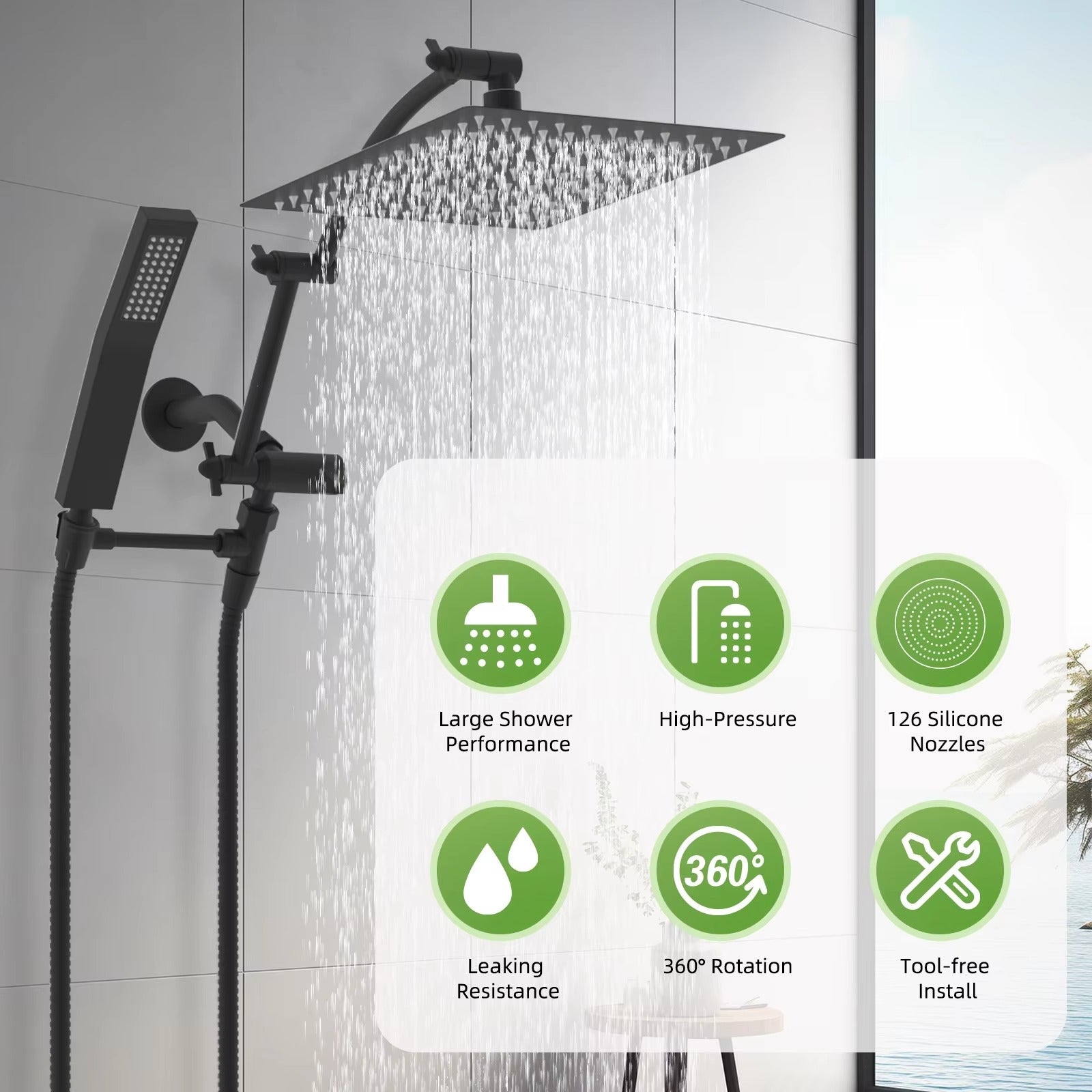 Experience the ultimate shower upgrade with this high-pressure dual shower head combo system. The handheld wand delivers powerful, invigorating spray patterns while the fixed overhead head provides steady coverage. The 16" adjustable arc-shaped extension arm lets you customize height and angle for your perfect shower experience. Durable construction handles daily use, and the high-pressure design maximizes water flow for a spa-like feel. Ideal for families seeking flexibility and performance in one complete system.