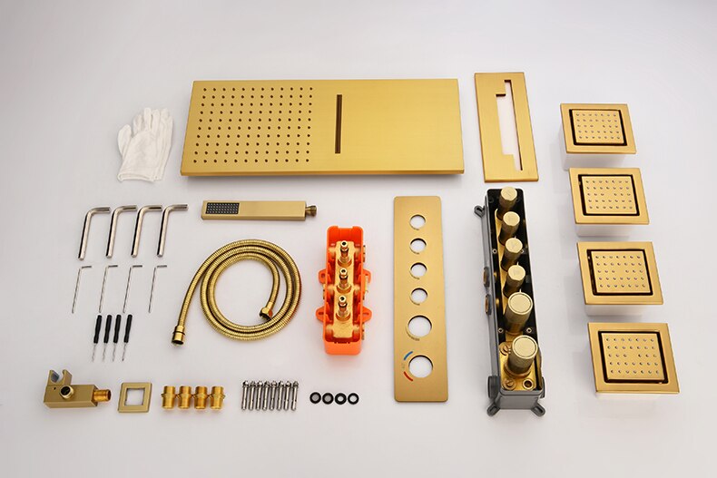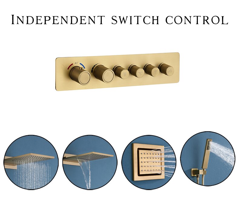 Upgrade your bathroom with the Juno 22 Inch brushed gold finish Wall Mount Shower Head with 6 Knobs Mixer and enjoy the ultimate shower experience in style.