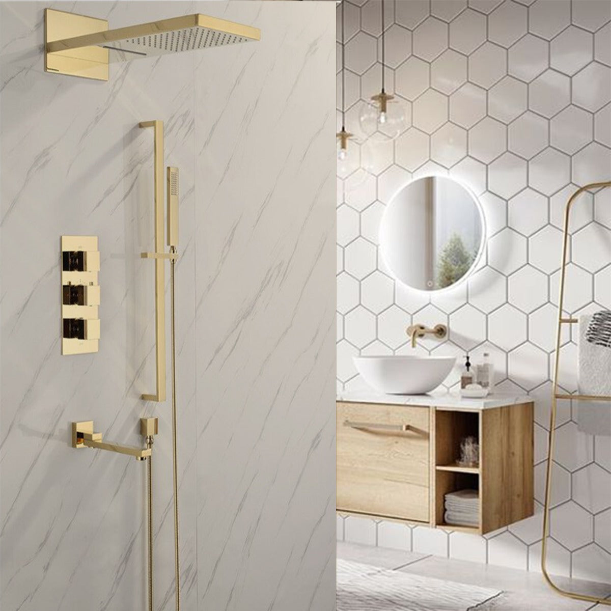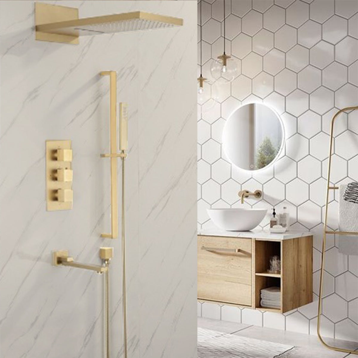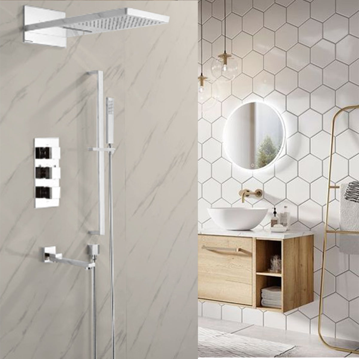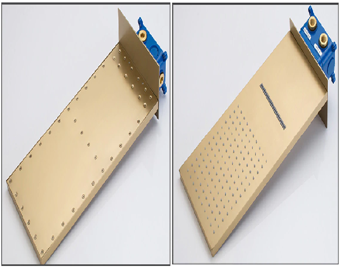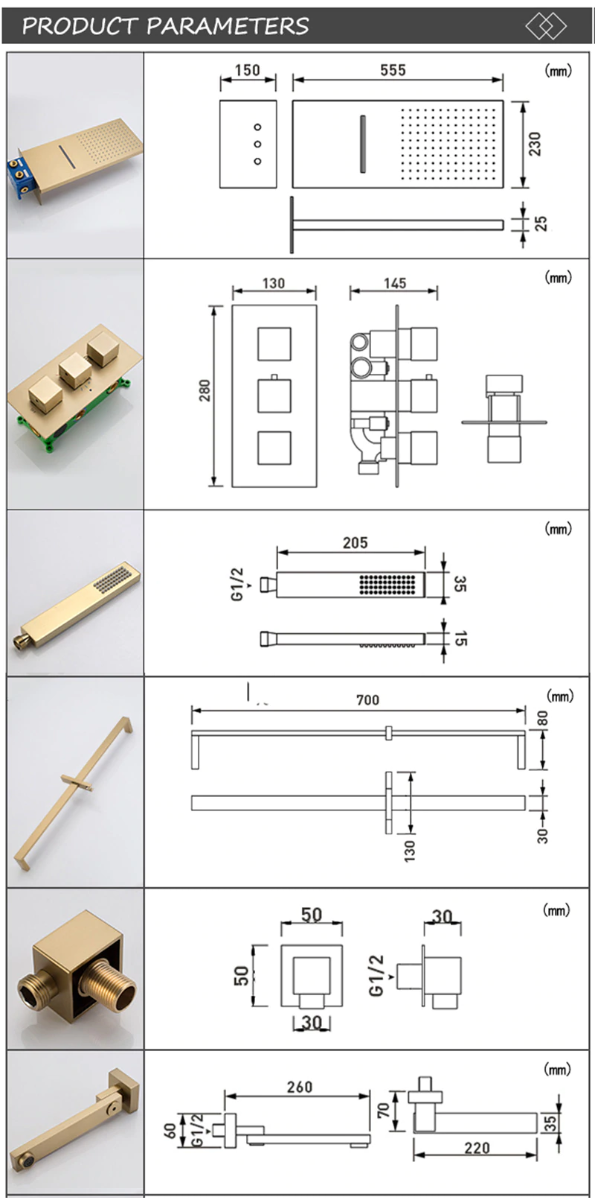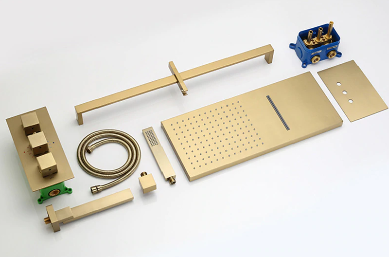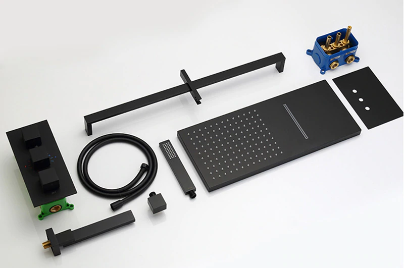 This shower comes with a rectangular shower head and a handheld shower. The shower head is fixed to the wall using a shower arm. Water is diverted to the hand shower through a shower hose. The shower head provides both rainfall and waterfall options. The system comes with three handles that helps divert the water flow and also change the water fall option.. The thermostatic valve in-built in the shower helps to keep the temperature at a constant level.