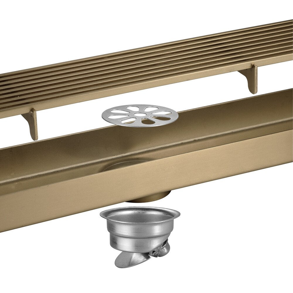 The Juno 60cm shower drain is a high-quality stainless steel product designed for use in bathroom floors. It is available in multiple finishes, including bronze, gray, brushed gold, and brushed rose gold.