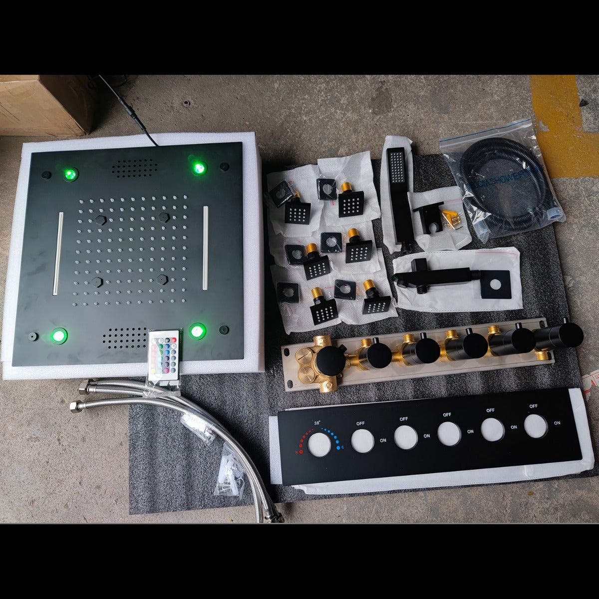 The Juno Black 16 Inch Musical Ceiling Mount LED Luxury Shower Head with Body Jets is a high-end shower system that offers a luxury and spa-like showering experience. The shower head have built-in speakers that connect to your Bluetooth-enabled device, allowing you to enjoy music while showering.