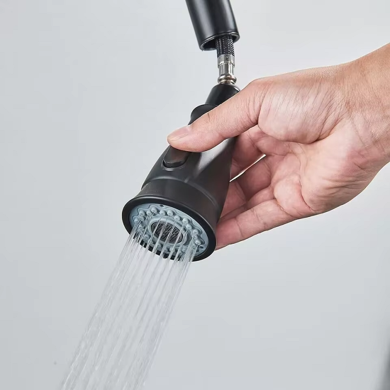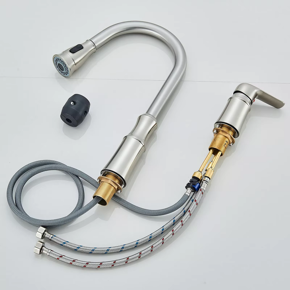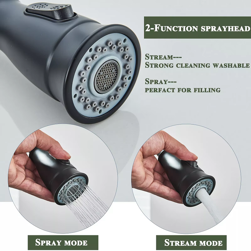 The juno black and brushed nickel finish pull down kitchen faucet is a stylish and deck-mounted kitchen fixture designed for modern homes. It features a durable stainless steel 304 housing with a brushed, combining durability and elegance. The single-handle control enables easy temperature and flow adjustment, while the pull-down spout enhances flexibility for cleaning and food preparation. Compatible with two-hole deck installations and finished in matte black or brushed nickel, this faucet blends contemporary style with reliable ceramic valve performance for lasting use. Its compact 15cm height and 175cm reach make it a perfect fit for most kitchen sinks.