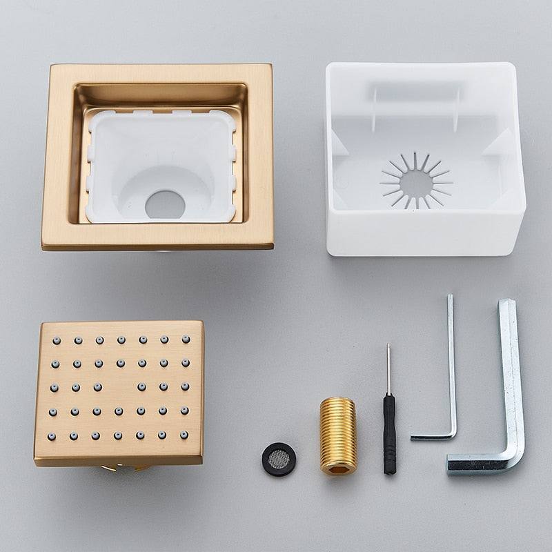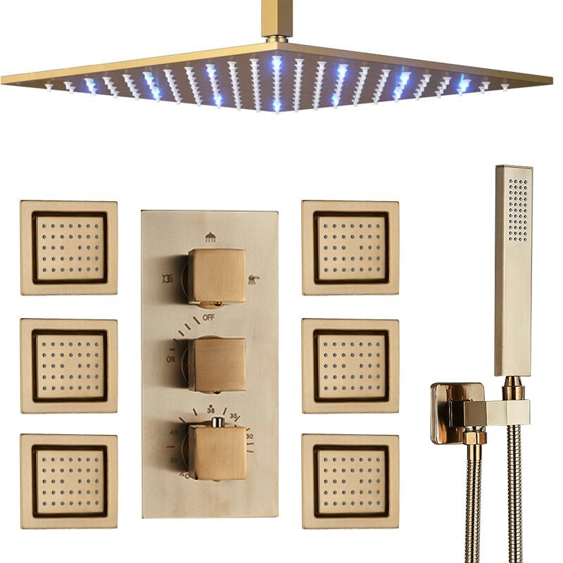 Looking for a luxurious and stylish shower head that will make your daily showers feel like a spa experience? Look no further than the Brushed Gold LED Rain Shower Head Wall Mount Ceiling Mount! This gorgeous shower head is made of brushed gold and is available in a square shape. It has a thermostatic shower mixer with three knobs, so you can easily control the water temperature and pressure. The LED lights create a beautiful ambiance in your bathroom and add a touch of luxury. Installation is quick and easy, so you can enjoy your new shower head sooner rather than later. Give your bathroom an upgrade today with the Brushed Gold LED Rain Shower Head Wall Mount Ceiling Mount!