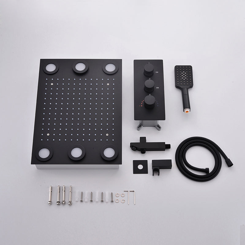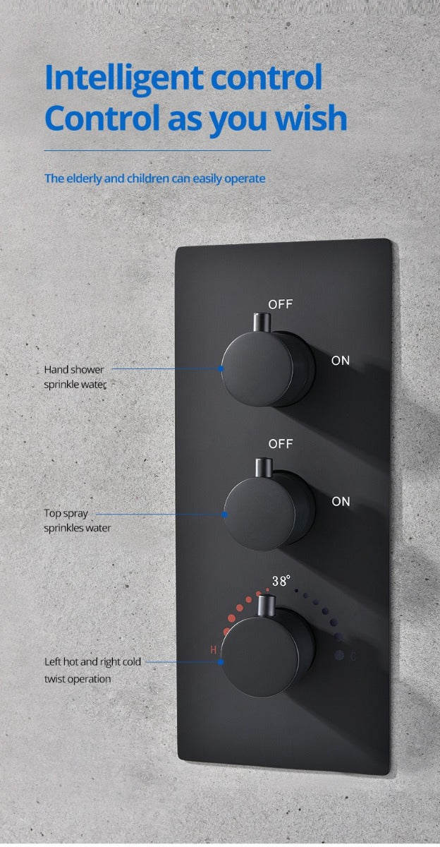 Introducing Juno Black LED Shower Head is a complete soution to a modern bathroom. The 20 inch led shower head will automatically change colors according to the temperature of the water so you always know how the water will feel on your skin just by looking at it.