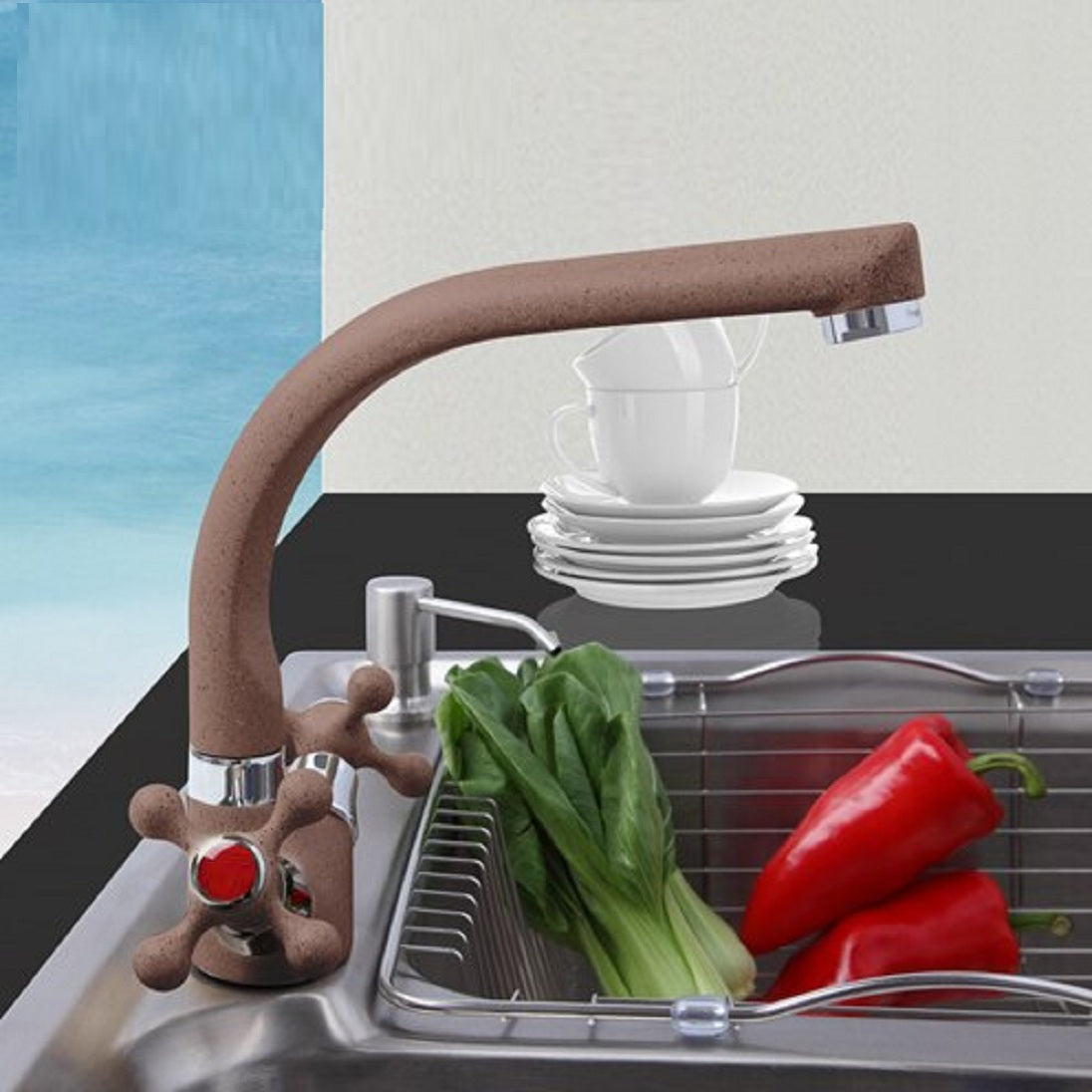 Juno Multicolor Spray Paint Dual Handle Kitchen Sink Faucet shines with spray dotted luster. It is durable, sturdy and easy to install. It freely matches various kitchen sink. Kitchen Sink Faucet has a single handle, with built-in hot and cold water mixer. It is easy to install deck mount single hole required. Only the best materials have been used: the body is made of solid brass and the valve cartridge is ceramic, for long lasting life time. It comes complete with accessories and installation instructions.