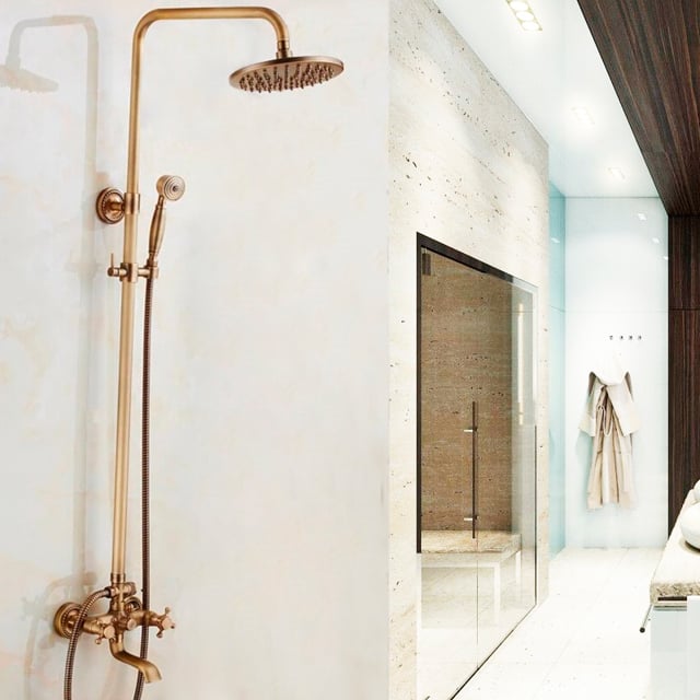 Juno New Polished Brass Shower Head With Handheld Shower Mixer and Tub Spout Shower Set is wall-mount, the material is overall brass, while the valve core material is ceramic for best performance and long-lasting life time. It comes complete with accessories and installation instructions.