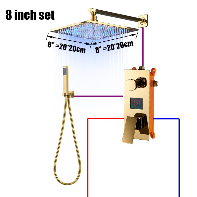 Our Juno Polished Gold 3 Way LCD Mixer Valve With Digital Display Bath Shower Faucet is a multifunctional shower set that offers everything needed for a delightful shower experience. Its shower head which works two ways Rainfall and Waterfall, and the shower set comes with different water ways options. It also comes with brass hose Standard 1/2 " plumbing connection Hot/ Cold water hose that will be connected to water pipe. The minimum pressure required is 28psi and maximum pressure required 72psi.