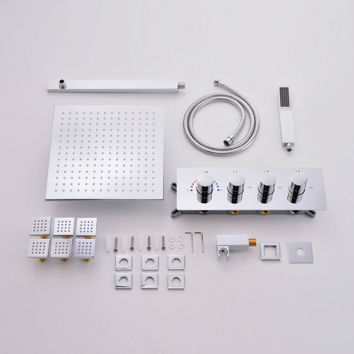 Product Type: Shower Head Finish Type: Chrome Installation Type: Wall Mount Shower Type: Rainfall Features: 6 Body Jets with Handlheld shower Material Type: Brass Shower shape: Square