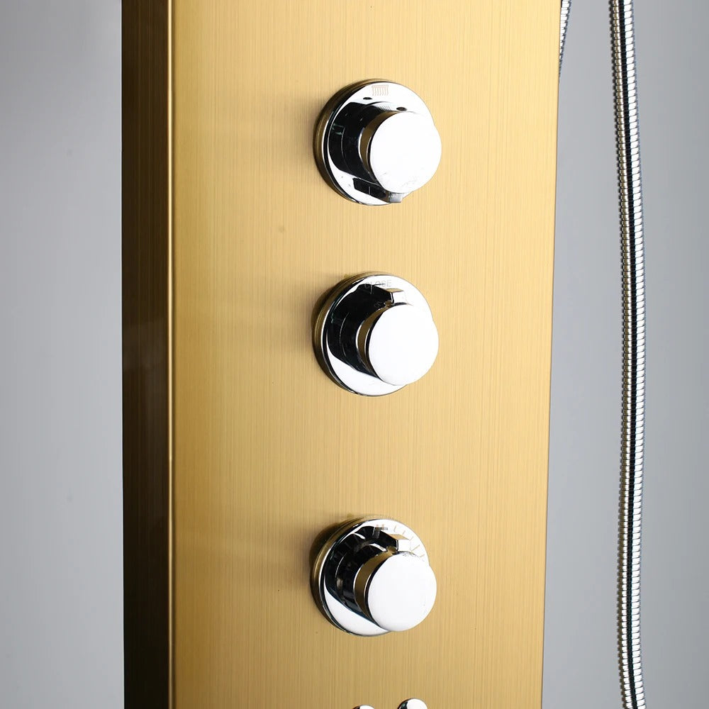 Transform your bathroom into a spa-inspired retreat with the JunoShowers 4-Function Brushed Gold Shower Panel System. Designed with a bar-shaped shower head and finished in elegant brushed gold, this wall-mounted unit combines durability, innovation, and luxury.