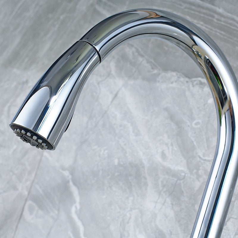 Kitchen sink faucet pull out sprayer in Chrome finish. Single handle deck mount hot and cold water mixer and swivel body of faucet. This can be use in commercial kitchen like hotels, restaurants and home use.