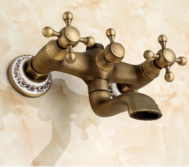 Two handle claw foot bathtub faucet made of brass and finish of aged brass. Wall mount installation Without Slide Bar. Its handshower can give you more pleasure of tub shower. Two handles are easy to use and you can use it to mix hot and cold water according to your body temperature. Handheld shower sprayer have 63" shower hose.